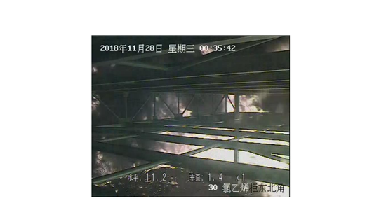 調取氣柜東北角的監控視頻(視頻時間比北京時間慢7分2秒),顯示1#氯乙烯氣柜發生過大量泄漏;零時40分55秒觀察到氣柜南側廠區外火光映入視頻畫面。(見下圖)