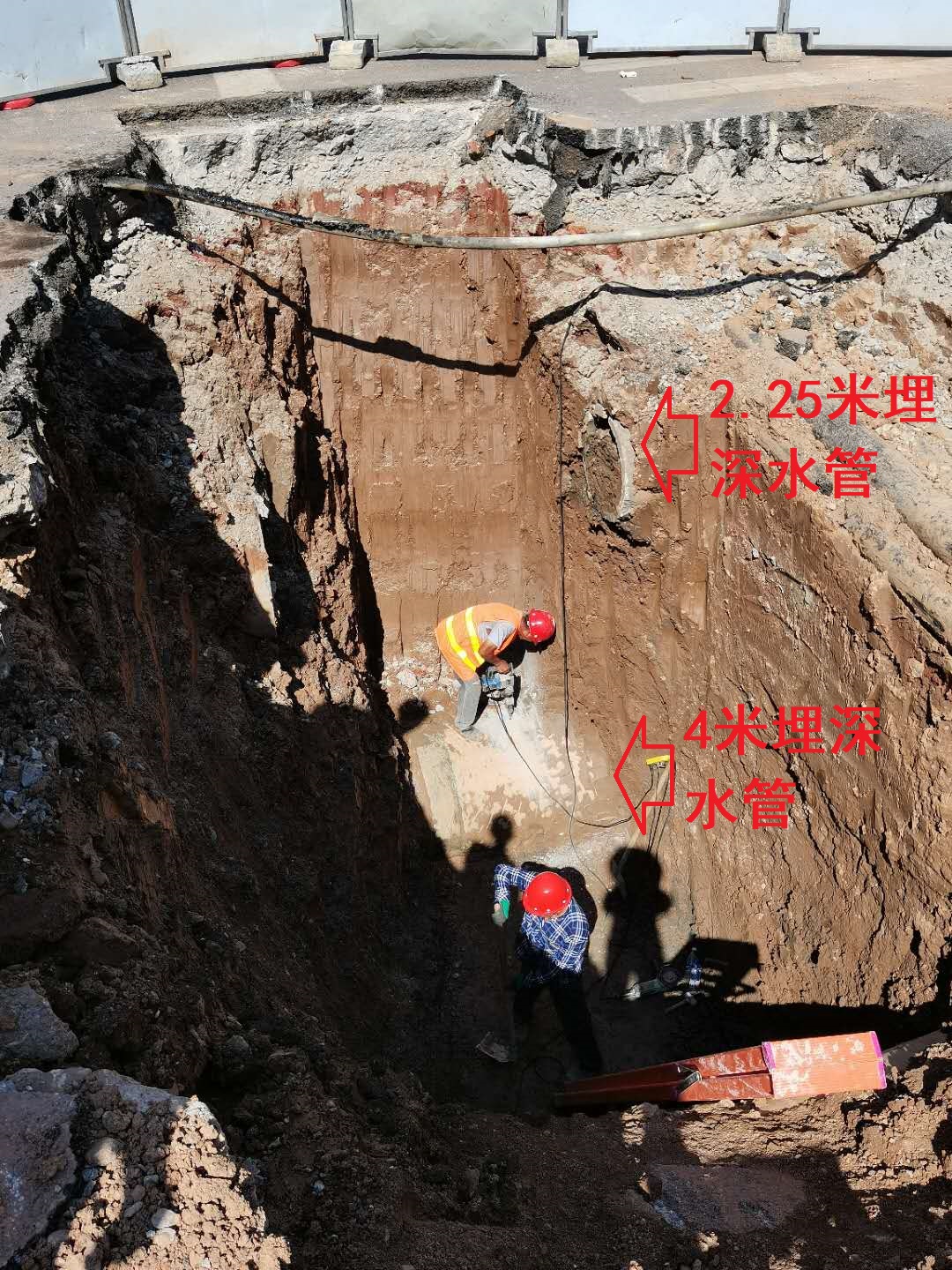 該項目于8月28日開始施工,8月29日完成了管網對接的土方工程,在蒸湘北路與華源支路交匯處的東側開挖了一處長8.1米,寬4.6米,深約5米的基坑,該基坑未采取放坡、支護等防護措施,不符合《給水排水構筑物工程施工及驗收規范(GB50141-2008?)》中4.4相關要求。8月30日上午,周某某派遣何某某、肖某某下至基坑對接施工萬陽和府小區污水管與市政污水管(見圖一)。約10時07分,肖某某在靠基坑西側用電鎬對市政污水管(埋深4米)進行開孔作業時,產生巨大振動,導致上方排水管(埋深2.25米)和上方土壤突然坍塌,兩人被掩埋(見圖二)。