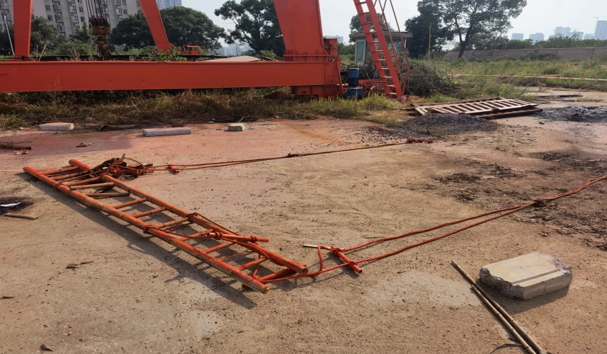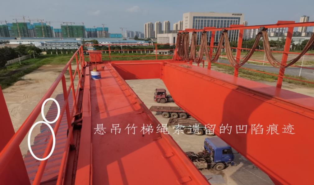 2021年9月4日7時左右,山海建設公司油漆工雷耀輝、劉奇林、劉曉田、劉天恒在中船物資中南公司902倉庫,對露天貨場32T門式起重機進行油漆涂裝作業。劉曉田坐在距離地面8米高的簡易竹梯上對起重機配電室底部進行涂裝作業(詳見圖1、圖2),竹梯兩端由尼龍繩索連接在起重機主梁的欄桿上(詳見圖3),其中一端系打死結、另一端系打活結。劉奇林站在起重機主梁上根據劉曉田作業需要,通過松解并調整活繩結在起重機主梁上的位置,帶動下方竹梯移動。7時13分左右,劉曉田在竹梯上從系打活結一側挪動至系打死結的一側后,劉奇林松解了活結并準備調整位置,此時系打死結的繩結突然松脫,劉曉田隨竹梯一起開始下墜,并帶動另一側繩索瞬間從劉奇林手中脫開,劉曉田隨竹梯一起墜落至地面受傷。7時47分,120救護車到達事故現場將劉曉田送至江夏區協和醫院救治,8時57分,劉曉田因傷勢過重經搶救無效死亡。