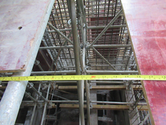 深度處理車間外架出入口至事發位置上方用木模板在盤扣式鋼管腳手架上鋪設通道,距支撐底部約3.6米。通道木模板以及事故發生位置上方木模板與腳手架鋼管均未固定牢固,且事故發生位置上方木模板蓋板鋪設不嚴密,蓋板橫向尺寸小于洞口(即相鄰模板支撐立桿之間)尺寸約44厘米。調查組分析認為,不排除趙才思從該處往下攀爬模板支撐架進入其工作位置過程中墜落或在通行過程中不慎從此處洞口墜落的可能(見圖3)。