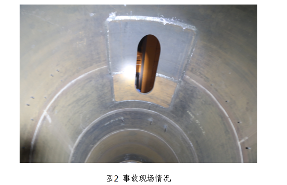 2.事故現(xiàn)場情況:(1)事故現(xiàn)場的風機塔筒直徑4.95米,塔筒的上方有一個設計預留的側門,側門呈圓角矩形,側門長2.81米,寬0.74米(圖2);