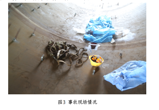 (2)塔筒內壁分布有鉚扣,死者躺在風機塔筒內,正上方是塔筒預留的側門,死者身上穿戴著安全帶,未系安全繩,安全帽掉落在一旁,死者身下有一攤血(圖3);