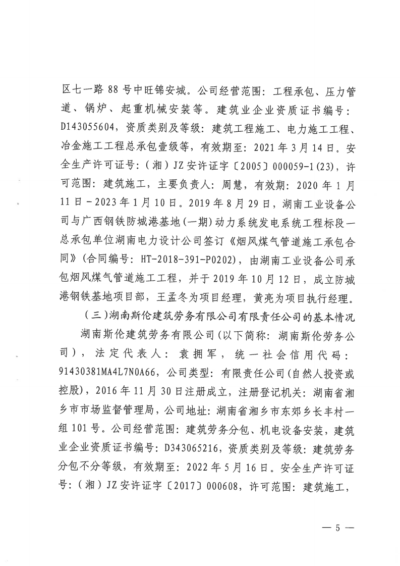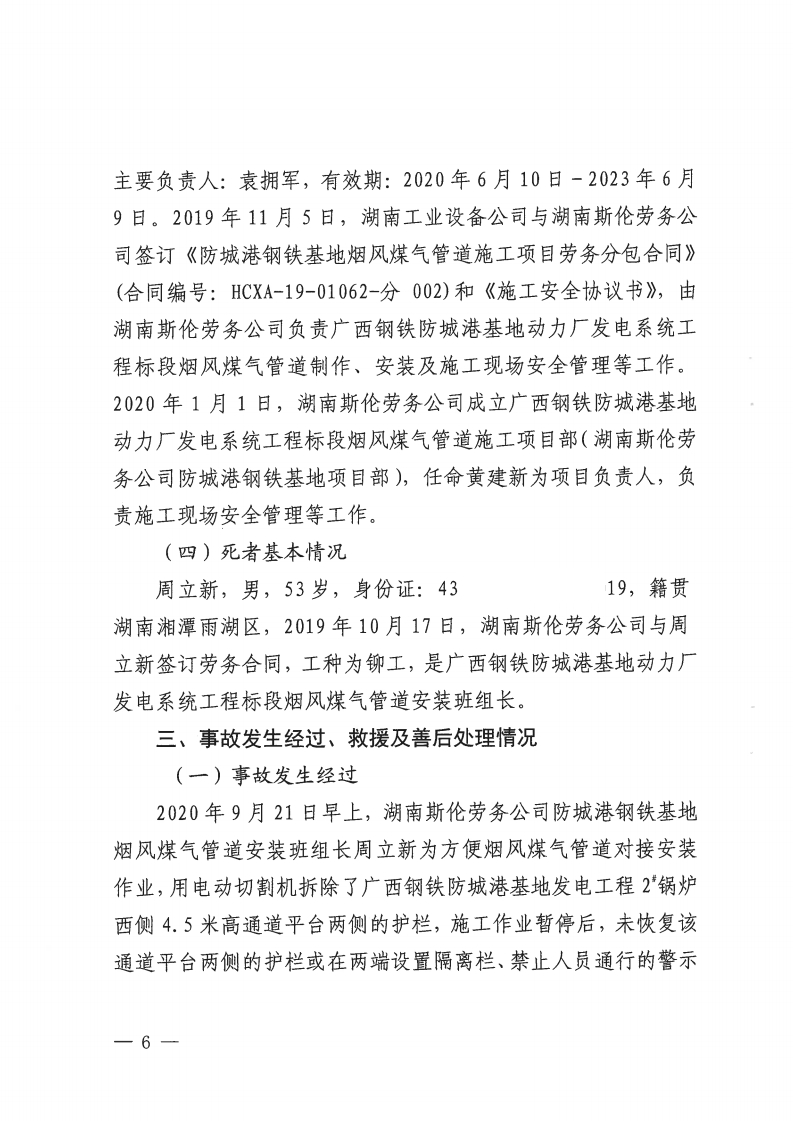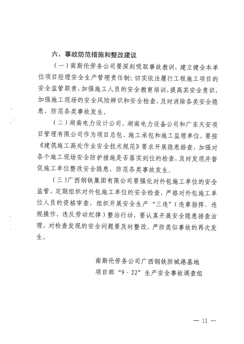 湖南斯倫建筑勞務有限公司廣西鋼鐵防城港基地項目部“9·22”生產安全事故調查報告