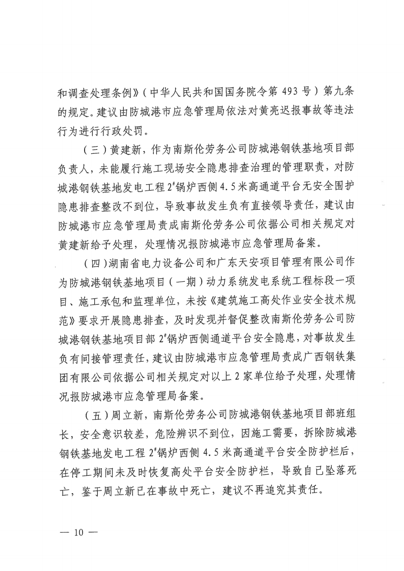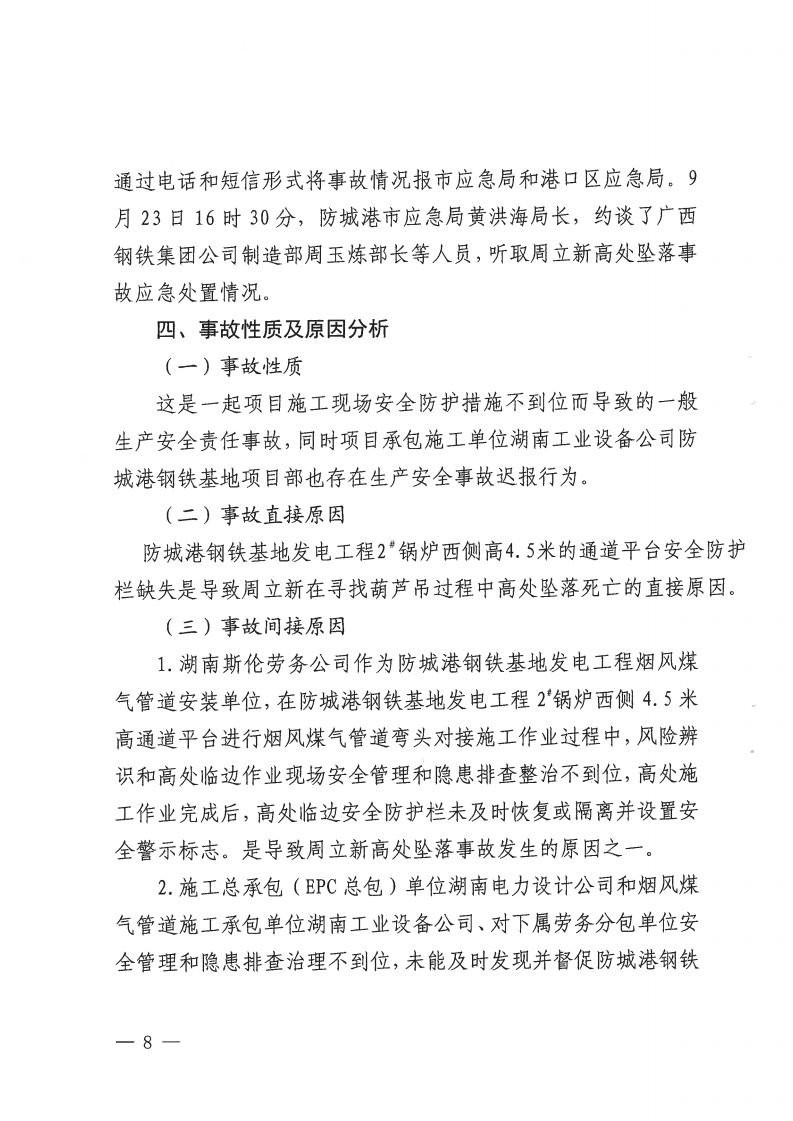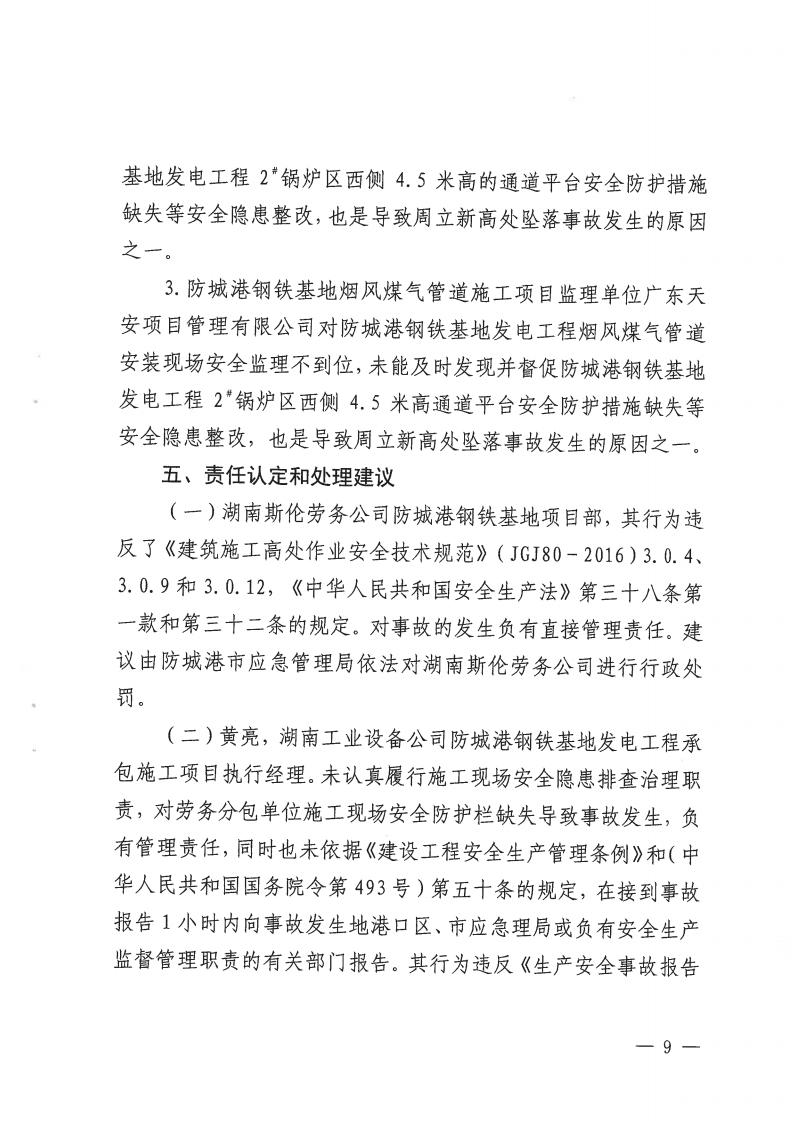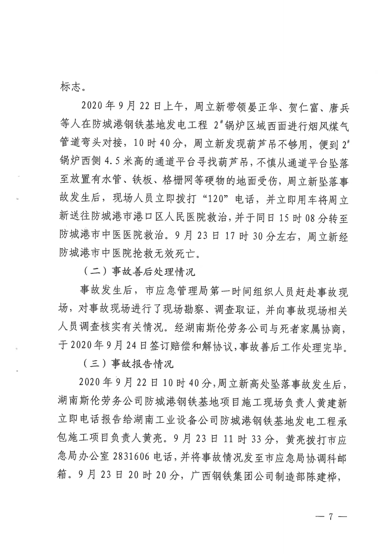 湖南斯倫建筑勞務有限公司廣西鋼鐵防城港基地項目部“9·22”生產安全事故調查報告