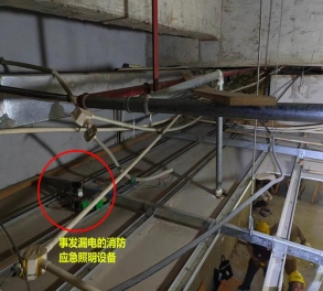 消防應急照明設備漏電,使得與其接觸的鋼質龍骨骨架整體帶電,蘭某香的腳踝碰觸龍骨金屬骨架而觸電是造成本次事故發生的直接原因。