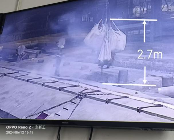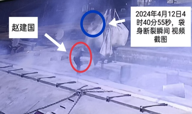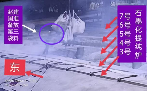 2024年6月11日夜班,1#石墨化提純車間當班共4人,班長為張*紅,職工為趙*國、賈*濤、王*陽。張*紅安排賈*濤在12#爐出爐,王*陽、趙*國和張*紅3人對5#爐裝爐。6月12日4時許,王*陽在5#石墨化爐西側操作多功能吸料天車平整填充的保溫料,張*紅和趙*國在5#爐東側添補保溫料。4時21分,張*紅用北東4#行車采用一掛四吊鉤吊運4袋噸袋保溫料,對5#爐頂部進行補料填充。4時40分,趙*國沿4#和5#爐中間爐墻走到噸袋吊鉤北側,躬身(背向4#爐)對第3袋保溫料進行劃口放料時,袋身突然斷裂,泄落的保溫料撞擊其頭部,致使趙*國仰面跌入4#爐內(4#爐表面溫度約1000℃)并瞬間起火燃燒。(見視頻截圖2、圖3)