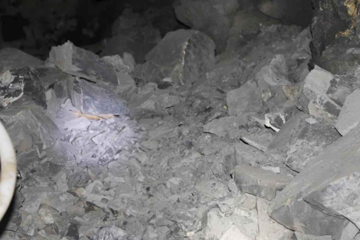 經(jīng)河池市金城江區(qū)應(yīng)急管理局執(zhí)法人員于2022年4月12日?4時(shí)45分至12日5時(shí)28分實(shí)地勘查,事故現(xiàn)場(chǎng)位于廣西博鋒礦業(yè)投資股份有限公司金城江區(qū)五圩鎮(zhèn)鉛鋅銻礦北二級(jí)斜井(+290米—+220米),距離斜井底約15米,冒落的石塊鋪滿斜井底板(巷道寬度約2.3米、高度約2.3米),巷道側(cè)面斜放一根長(zhǎng)約1米的撬棍,巷道頂部及邊幫出露一條長(zhǎng)約3米、寬約2米的冒落痕跡,巷道頂部、邊幫有數(shù)根錨桿外露20厘米至80厘米不等,有些已變形。冒頂位置周圍的巖石節(jié)理、裂隙較發(fā)育,往斜井下部及斜井上部局部均掛有錨網(wǎng),井口已錨噴。因不具備安全條件,中心現(xiàn)場(chǎng)位置未能冒險(xiǎn)深入勘察,未發(fā)現(xiàn)血跡等物證。現(xiàn)場(chǎng)情況如下圖: