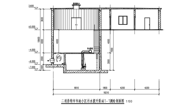 二連浩特市市政小區污水提升泵站,于1995年投入使用,位于二連浩特市市政小區院內南部,污水提升泵站占地面積90平方米,泵池占地面積50平方米,容積350立方米,泵池結構為鋼筋混凝土,泵池為直徑8.01米、高度7米的圓柱形,在-4米處設有作業平臺并在泵池中間設有污水池隔斷墻,泵池-4米以下分割為2個相等的污水池和1個分配井,-4米作業平臺為混凝土結構。作業平臺西側-4米至-6米處設有分配井,其結構尺寸為1.8m*1.8m*2m。分水池頂部用鋼板封閉,防止人員墜落。-4米作業平臺中心偏東側設有4處水泵吊裝口,并配有4臺抽水泵,每臺功率15千瓦,每小時出水120立方米,東側設有2處80cm*80cm正方形人孔。