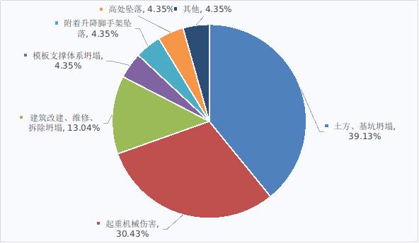 全國房屋市政工程生產安全較大及以上事故按照類型劃分,土方、基坑坍塌事故9起,占事故總數的39.13%;起重機械傷害事故7起,占總數的30.43%;建筑改建、維修、拆除坍塌事故3起,占總數的13.04%;模板支撐體系坍塌、附著升降腳手架墜落、高處墜落以及其他類型事故各1起、各占總數的4.35%(見圖6)。