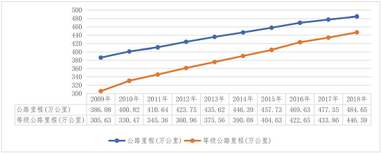 據(jù)國家統(tǒng)計(jì)局公開統(tǒng)計(jì)資料顯示,2009年至2018年10年間,國家公路里程(公路里程統(tǒng)計(jì)范圍:包括城間、城鄉(xiāng)間、鄉(xiāng)(村)間能行駛汽車的公共道路,公路通過城鎮(zhèn)街道的里程,公路橋梁長度、隧道長度、渡口寬度)增長100萬公里,其中等級(jí)公路增長勢(shì)頭迅猛(如圖1所示),增長率超過公路總里程,達(dá)到46%。