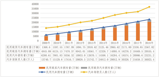 隨著國家交通基礎(chǔ)設(shè)施的日益完善,國民生活水平的不斷提高,國內(nèi)機(jī)動(dòng)車保有量、汽車駕駛員人數(shù)節(jié)節(jié)攀升。從圖2可以看出,截至2018年末,全國民用汽車保有量達(dá)2.3億輛,年增長11%,更是達(dá)到10前年的3.7倍;在汽車保有量中,私人汽車保有量為2.1億輛。同期,全國機(jī)動(dòng)車駕駛?cè)?/span>4.2億人,其中汽車駕駛?cè)?/span>3.8億人,年增長17%,達(dá)到10前年的2.7倍,各項(xiàng)數(shù)據(jù)均呈現(xiàn)跨越式增長。