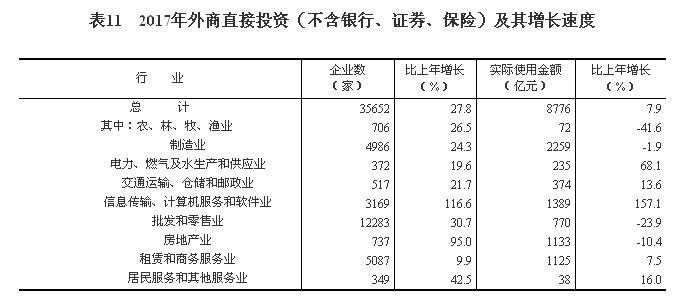 全年吸收外商直接投資(不含銀行、證券、保險)新設立企業35652家,比上年增長27.8%。實際使用外商直接投資金額8776億元(折1310億美元),增長7.9%,增速比上年加快3.8個百分點。其中“一帶一路”沿線國家對華直接投資新設立企業3857家,增長32.8%;對華直接投資金額374億元(折56億美元)。全年高技術制造業實際使用外資666億元,增長11.3%。