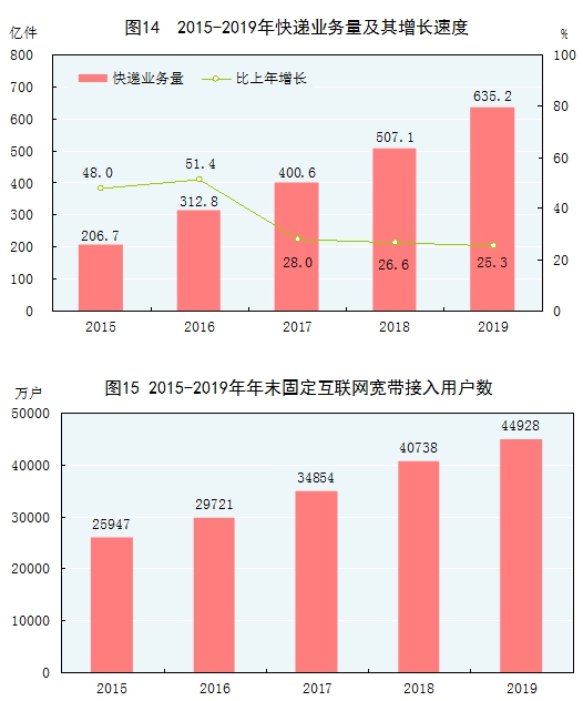 全年完成郵政行業(yè)業(yè)務總量[40]16230億元,比上年增長31.5%。郵政業(yè)全年完成郵政函件業(yè)務21.7億件,包裹業(yè)務0.2億件,快遞業(yè)務量635.2億件,快遞業(yè)務收入7498億元。全年完成電信業(yè)務總量[41]106789億元,比上年增長62.9%。年末全國電話用戶總數(shù)179238萬戶,其中移動電話用戶160134萬戶。移動電話普及率上升至114.4部/百人。固定互聯(lián)網(wǎng)寬帶接入用戶[42]44928萬戶,比上年末增加4190萬戶,其中固定互聯(lián)網(wǎng)光纖寬帶接入用戶[43]41740萬戶,增加4907萬戶。全年移動互聯(lián)網(wǎng)用戶接入流量1220億GB,比上年增長71.6%。全年軟件和信息技術服務業(yè)[44]完成軟件業(yè)務收入71768億元,按可比口徑計算,比上年增長15.4%。