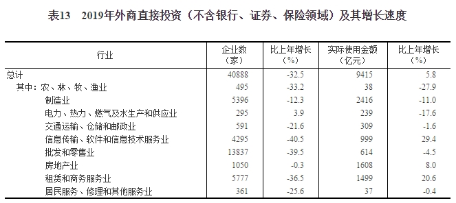 全年外商直接投資(不含銀行、證券、保險領域)新設立企業(yè)40888家,比上年下降32.5%。實際使用外商直接投資金額9415億元,增長5.8%,折1381億美元,增長2.4%。其中“一帶一路”沿線國家對華直接投資新設立企業(yè)5591家,增長24.8%;對華直接投資金額(含通過部分自由港對華投資)576億元,增長36.0%,折84億美元,增長30.6%。全年高技術產(chǎn)業(yè)實際使用外資2660億元,增長25.6%,折391億美元,增長21.7%。