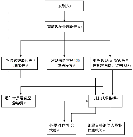 1 | 員工傷亡 | 1、現場最高指揮者應立即組織人員搶救傷員,并注意保護現場急打120,送傷員進醫院搶救治療;同時報公司管理者代表。 2、按傷亡事故輕重程序,公司安全主管部門應向公司領導匯報,按國家有關規定上報。 3、組織傷亡事故調查、分析,做到“四不放過”。 4、若為觸電事故,應首先使觸電者脫離電源,在現場進行人工呼吸或擠壓心臟法搶救,同時報120急救中心。 |