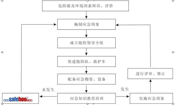根據(jù)本工程的特點及施工工藝的實際情況,認真地組織了對危險源和環(huán)境因素的識別和評價,特制定本項目發(fā)生緊急情況或事故的應急措施,開展應急知識教育和應急演練,提高現(xiàn)場操作人員應急能力,減少突發(fā)事件造成的損害和不良環(huán)境影響。其應急準備和響應工作程序見下圖: