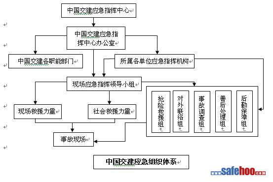 中國交建及所屬單位的指揮中心(機構)設置及職責同“綜合預案指揮機構及職責”。各項目經理部(車間)應結合自身實際,進一步明確現場應急指揮領導小組各成員及部門的職責,應主要包括以下內容: