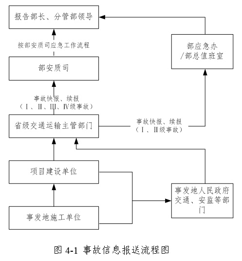 事發地省級交通運輸主管部門應急聯絡員或值班部門接報事故后,應當立即口頭或短信報告部安質司應急聯絡員或部安質司責任處室相關人員,并按照《交通運輸行業建設工程生產安全事故統計報表制度》要求,在1小時內將信息上報至部安質司,其中Ⅰ、Ⅱ級事故還應按照《交通運輸突發事件信息報告和處理辦法》的要求上報部應急辦,并及時續報相關情況。事故信息報送流程如圖4-1所示。