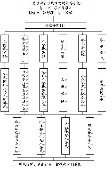 ?、诤闉陌l生后,在項目經理或主持工作的項目書記的統一指揮下,應急預案督導小分隊、機械物資供應小分隊、后勤保障小分隊和現場搶救小分隊等各盡其責,立即進入救災現場。