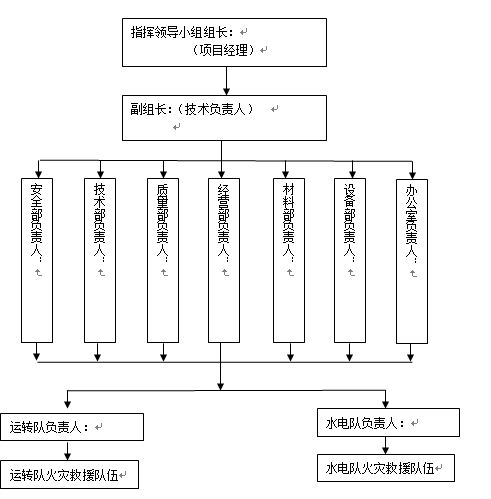 (1)指揮領導小組:負責本單位火災“預案”的審批;組建火災救援隊伍,檢查督促做好火災事故的預防措施和火災救援的各項準備工作。由項目部各組主要人員、各分包單位主要人員組成,由項目經理負責,成立指揮部。