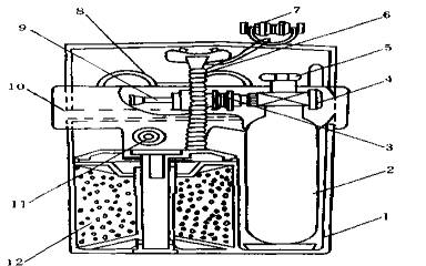 7—鼻夾;8—眼鏡;9—自動(dòng)補(bǔ)給端桿;10—氧氣袋;11—排氣閥;12—二氧化碳吸收劑