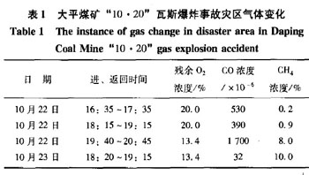 瓦斯爆炸后,不僅井下O:濃度會大大降低,而且還會產(chǎn)生大量有害氣體(表1).統(tǒng)計資料表明_4 J:在瓦斯、煤塵爆炸事故中,死于CO中毒的人數(shù)占死亡總?cè)藬?shù)的70% 以上.據(jù)大平煤礦“l(fā)0?20”礦難資料,井下積聚瓦斯空間的體積在爆炸發(fā)生時會迅速膨脹,有害氣體是引起這起重大傷亡事故的主要因素之一.
