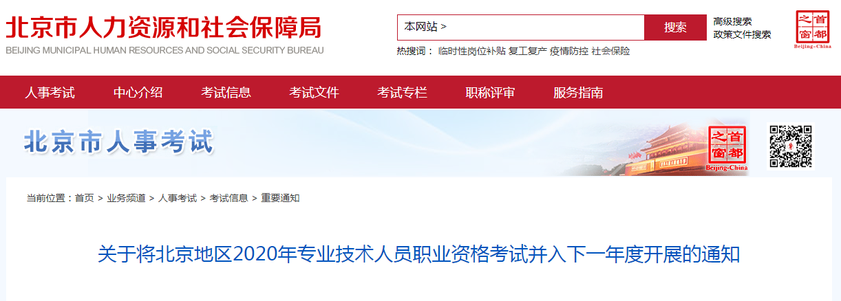 關于將北京地區2020年專業技術人員職業資格考試并入下一年度開展的通知