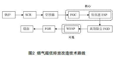 燃煤電廠超低排放改造的重點和關鍵在于粉塵的達標排放[4]。針對國內燃煤電廠使用的除塵設備80%以上為電除塵器,同時借鑒發達國家先進的電除塵技術,可采用“協同控制”和“末端治理”的技術路線,如圖2。