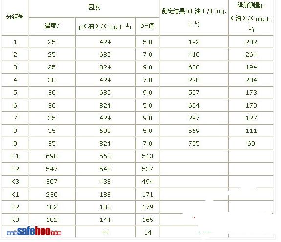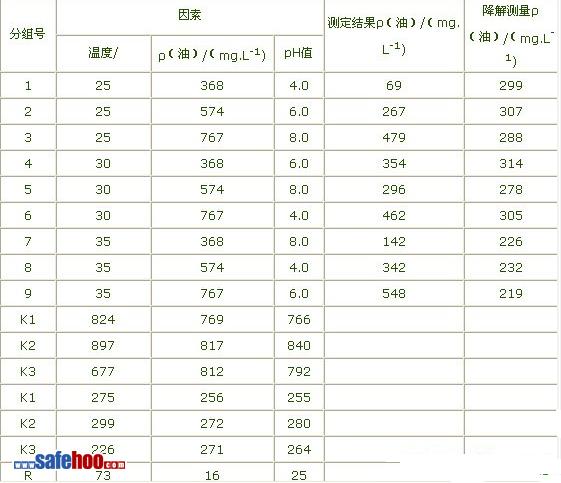 在保證供氧和氮、磷營養(yǎng)前提下,選擇溫度。油的質量濃度(以mg/L計)和pH值作為本次實驗的三個因素進行三水平實驗,方案見表1、表2。將平板培養(yǎng)48h的菌體刮下,5000r/min離心5min,分離得到濕菌體。向方案中每個樣品加入0.5g濕菌體,培養(yǎng)60h后測定樣品中油的質量濃度。