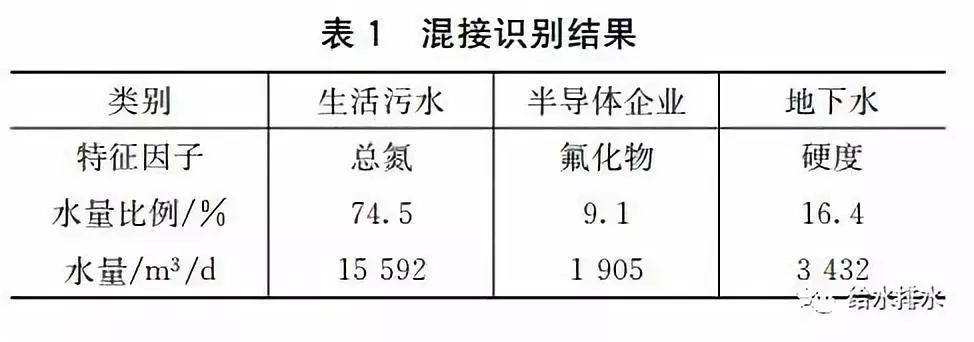 如圖3所示的研究區(qū)域,主要混接污染來源于生活污染和電子企業(yè),管網(wǎng)中的水量還包括地下水,根據(jù)特征因子的混接識別計算確定了混接污水量和地下水量。如表1所示,為混接改造提供了依據(jù)。