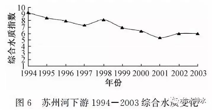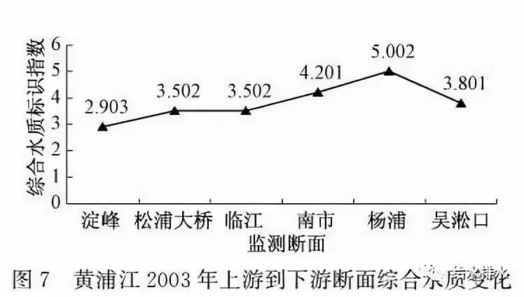 圖6表示了蘇州河下游1994年到2003年綜合水質(zhì)的變化,如果用單一指標(biāo),蘇州河水質(zhì)總磷一直劣于V類水,無法表達(dá)水質(zhì)的改善。圖7表達(dá)了黃浦江2003年上游到下游各斷面綜合水質(zhì)的變化,可以清晰界定區(qū)域責(zé)任,如果采用單一指標(biāo),很難對比。