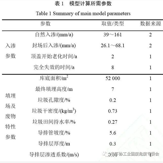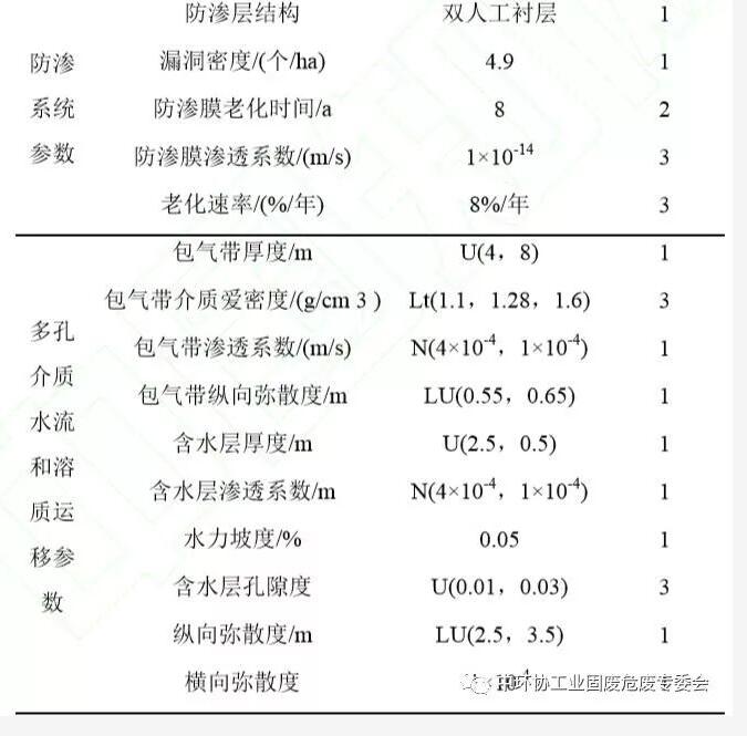 在不考慮HDPE膜老化的條件下,填埋場的滲濾液從產生、滲漏直至對地下水造成污染,需要經歷降雨、下滲、側向導排、淋溶、漏洞滲透和飽和-非飽和帶遷移-轉化等10余個地表地下水文過程。因此,準確評估填埋場滲濾液對地下水的影響,需要綜合考慮上述所有水文過程,計算將極為復雜。再考慮HDPE膜老化導致的性能指標參數變化,計算將更為復雜。為此,英國環保局委托Golder Associates開發了Landsim模型,對 HDPE膜老化條件下的滲濾液產生、滲漏及其地下水環境影響進行預測。只需要輸入填埋場結構設計、材料特性、水文地質條件及HDPE膜老化參數,就可以對 HDPE 膜老化條件下填埋場滲濾液的產生、 滲漏和地下水污染情況進行預測. 模型所需的主要參數詳見表1,所有參數當中,結構、材料特性參數通常根據設計資料確定、水文地質參數通過場地勘探確定,最為關鍵的是 HDPE膜老化參數的確定。
