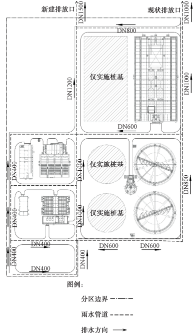 結合分區(qū)內平面布局、設施分布以及上文的海綿設施選型,對各個分區(qū)因地制宜地進行海綿設施布置,如圖2所示。其中道路兩側的植草溝主要收集道路雨水及周邊地塊雨水,地塊內部的植草溝和雨水花園主要收集地塊內的雨水徑流和經(jīng)斷接的屋面雨水,池頂綠化則主要設置于生物反應池厭缺氧池上方,用于收集池頂雨水。每個分區(qū)中起主要作用的海綿設施工程量如表3所示。擴建廠區(qū)雨水管道按照重現(xiàn)期為5年設計,雨水管網(wǎng)分布如圖3所示。超出海綿設施滯蓄能力的雨水通過溢流井溢流至雨水管道中,經(jīng)現(xiàn)狀 DN1000和新建 DN1500排放口排入廠區(qū)北側河道中。