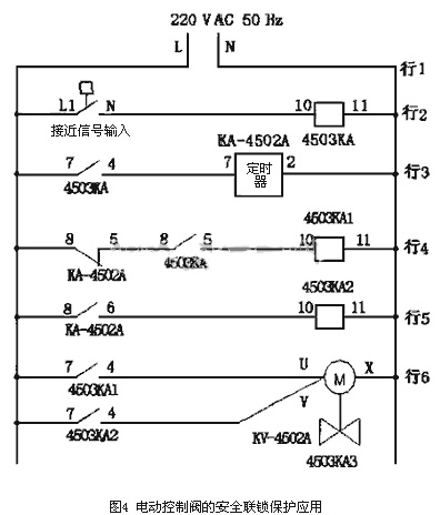 1.2電動控制閥的安全聯鎖保護電動控制閥的電動執行器是以220V交流單項電源作為驅動電源,接受來自調節器的毫安信號或電壓控制信號來進行工作的?,F在國內的電動控制閥大多采用進口的日本工裝電子式電動執行器,電子式控制單元常被設計成黑匣子形式,并用樹脂澆鑄,驅動電機采用交流可逆電機,可以正驅動或反驅動;驅動量的反饋檢測采用高性能的、高可靠性的電位器,以實現控制調節功能。切斷或調節電動控制閥的安全聯鎖保護歸根結底是通過安全聯鎖信號對驅動電機的驅動電源的控制,以實現驅動電機的正轉或反轉,來達到對控制閥的打開或關閉的目的。因此只要將安全聯鎖信號作為接點信號接人電動控制閥的電源控制回路中,當安全聯鎖信號動作時,也就是接點信號動作,使得正驅動電源或反驅動電源接通,實現控制閥的打開或關閉。圖4所示為電動控制閥較復雜的安全聯鎖保護接線圖,通過接入定時器聯鎖控制電動控制閥的打開和關閉。在圖4行2中,引入安全聯鎖保護接點信號,接點閉合時,繼電器4503KA線圈得電,行3中4503KA常開接點7-4閉合,定時器KA-4502A開始計時,行4中4503KA常開接點8-5閉合,繼電器4503KA1線圈得電,行6中4503KA1常開接點7-4閉合,電動控制閥4503KA3正轉,閥門打開;當定時器KA-4502A計時到設定值時,其觸點動作,行4中定時器KA-4502A常聞接點8-5打開,繼電器4503KA1線圈失電,行6中4503KA1常開接點7-4打開,電動控制閥4503KA3正轉失電,同時行5中KA-4502A觸點8-6閉合,繼電器4503KA2線圈得電,行6中4503KA2常開接點7-4閉合,電動控制閥4503KA3反轉得電,閥門關閉。