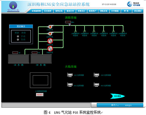 圖4為L(zhǎng)NG氣化站FGS系統(tǒng)監(jiān)控畫(huà)面,其由中控室上位監(jiān)視系統(tǒng)、現(xiàn)場(chǎng)火災(zāi)報(bào)警按鈕、聲光報(bào)警器等組成。當(dāng)探測(cè)設(shè)備產(chǎn)生報(bào)警信號(hào)后,為確保生產(chǎn)過(guò)程安全穩(wěn)定以及事故工況的應(yīng)急處理,上位監(jiān)視系統(tǒng)上立即彈出報(bào)警區(qū)域畫(huà)面。當(dāng)這個(gè)區(qū)域中發(fā)生的緊急情況(火災(zāi)等)經(jīng)操作員確認(rèn)后,F(xiàn)GS系統(tǒng)便關(guān)閉該區(qū)域相關(guān)的工藝閥門(mén)和設(shè)備。