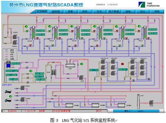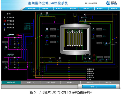 SAE-LSMS系統(tǒng)已成功在國(guó)內(nèi)應(yīng)用多年,2005年深圳美視電廠總管式增壓40kfg,氣化量48,000NM3/H,2007年深圳燃?xì)饧瘓F(tuán)梅林LNG應(yīng)急調(diào)峰站單元式增壓20kfg,氣化量小時(shí)40,000NM3/H,2008年南京港華兩個(gè)2500立方LNG子母罐氣化站均已應(yīng)用該系統(tǒng)。均取得了較好的效果。圖5為廣東潮州子母罐式LNG氣化站SCS系統(tǒng)監(jiān)控畫(huà)面。