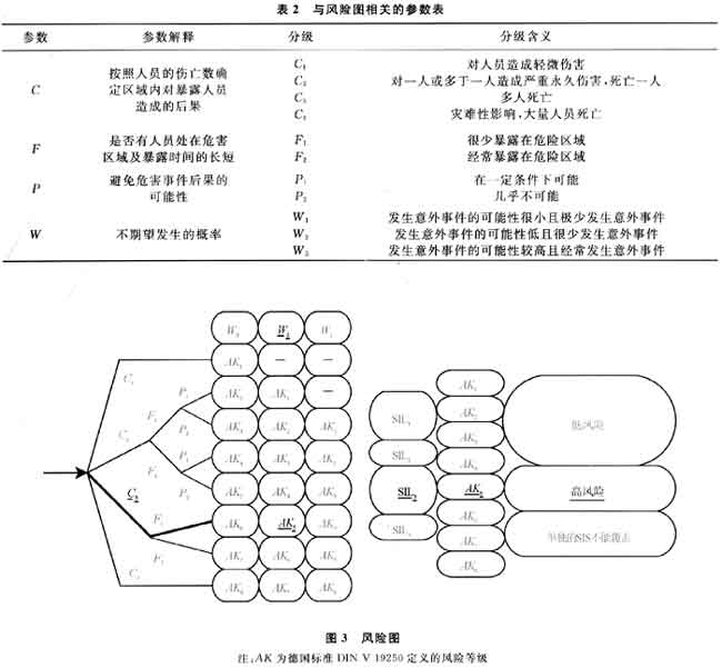??? 在不考慮所有安全防護措施的前提下,分析如果高壓氣體竄入低壓設備或管線,可能導致設備或管線爆炸的危害后果,評估爆炸事故發生后對人員、環境和經濟的損害程度。根據國家標準GB/T21109.3—2007[12]規定的風險圖參數表(如表2所示),確定選擇C3、F1和W2參數,將其應用到如圖3所示的風險圖上,并考慮環境和經濟的損失。評估結果顯示該處所需的安全完整性等級為SIL3,屬于高風險。