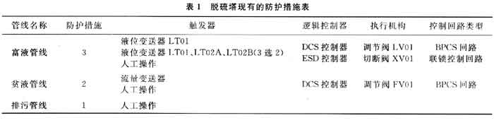 ??? 以某天然氣凈化廠的脫硫塔為例(該塔屬于重點高壓設備)。含硫天然氣在塔內由下至上,在常溫高壓條件下脫除其中的硫化氫后從塔頂排出,脫硫溶劑貧液自塔頂往下流,吸收含硫天然氣中的硫化氫后從塔底排出,進入低壓系統再生。為保證高壓介質不竄入低壓系統,除設置脫硫塔液位調節回路外,另設置了安全聯鎖控制回路,作為重要的防護層。該裝置現有防護措施如表1所示。