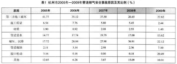 ??? 表1為杭州市2005年~2009年管道燃氣安全事故原因及其比例。