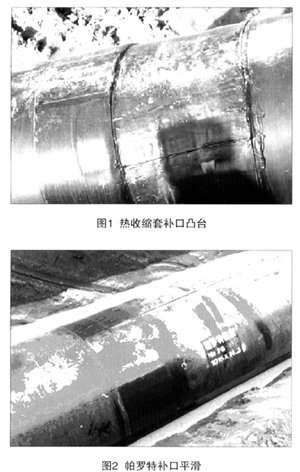 ??? 帕羅特防腐層主要用于定向鉆段,其兼具了環氧粉末防腐層與3PE的特點,抗擊碰傷的能力稍遜于3PE,但抗拖拉劃傷的能力極強,且沒有陰極屏蔽問題。帕羅特的突出優勢,在于其他防腐層需用熱收縮套補口(圖1),形成的凸出部分回拖時可能被劃傷或翻起,甚至整個熱收縮套滑移離位,而帕羅特補口采用現場噴涂或刷涂帕羅特補口涂料,保持補口部分與管體為平滑過渡(圖2),這些特點很好滿足了定向鉆穿越段防腐層的要求。