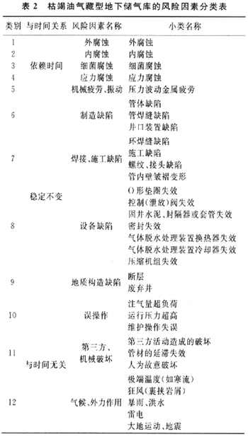 ??? 國際管道技術委員會(PRCI)曾將輸氣管道風險因素分為9個大類、22個小類。借鑒此分類方法,結合儲氣庫自身特點和事故資料統(tǒng)計分析,將枯竭油氣藏型地下儲氣庫風險因素劃分為12個大類、33個小類,并根據(jù)風險因素與時間的關系列表(表2)。