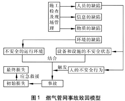 ??? 筆者認為:燃氣事故的發生是一些事件鏈的組合,由燃氣管網施工、運行過程中存在的管理失誤,產生人員、物質、環境和信息的缺陷,而這些缺陷又引起了職工的不安全行為、設備和設施的不安全狀態以及不安全的生產環境,最終導致了燃氣事故的發生。