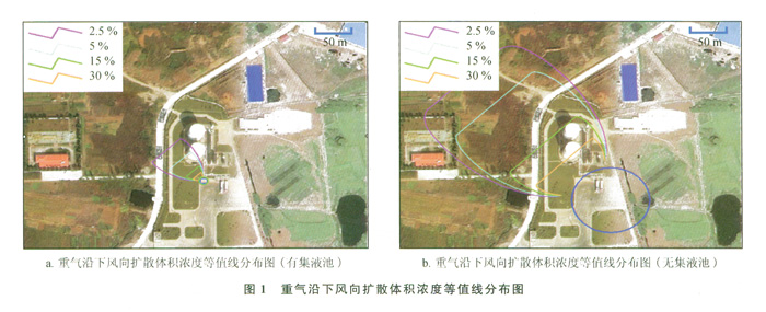 NFPA 59A—2009標準規定,重氣擴散事故中站場建筑紅線處LNG蒸氣在空氣中平均濃度不超過甲烷燃燒下限的50%(即2.5%)。利用平臺對裝卸車區的蒸氣擴散事故進行計算分析,事故影響范圍如圖1。由圖1-a可知,由于設置了集液池,形成的LNG溢出范圍及重氣云團尺寸較小(圖中圓形區域所示),甲烷體積濃度2.5%的等值線的影響范圍有限;由圖1-b可知,由于未設置集液池,形成的LNG溢出范圍及重氣云團尺寸(圖中圓形區域所示)遠大于有集液池的情況,相應甲烷體積濃度2.5%的等值線影響范圍非常大,遠遠超出廠區范圍。因此,在廠區的危險區域設置集液池收集泄漏的LNG,可有效控制重氣云團尺寸,減小LNG泄漏擴散造成的危害范圍。
