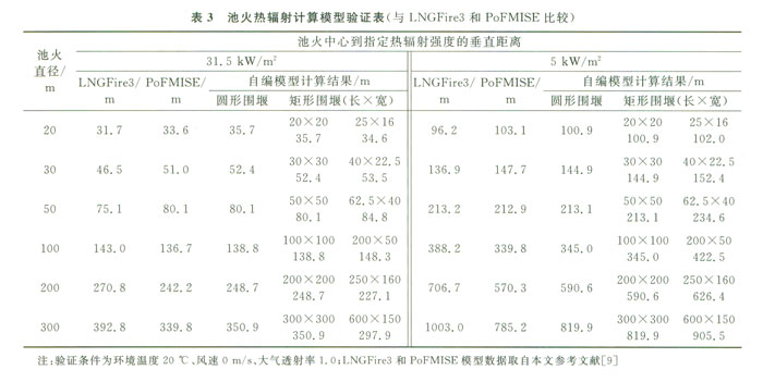 將研發的LNG池火熱輻射模型計算結果分別與LNGFire3模型和PoFMISE模型發表的標準計算結果[9]進行比較,來驗證模型的可靠性,驗證結果見表3。研發模型綜合LNGFire3固體火焰模型原理的優點和PoFMISE對大型池火表面熱輻射力的修正,獲得的結果介于兩種模型之間,對于小型池火較貼近LNGFire3,大型池火貼近PoFMISE,其相對誤差約為2.5%的正偏差,說明預測結果更趨安全。由此可知,研發的池火熱輻射模型綜合了LNGFire3和PoFMISE模型的優點,是合理、可靠的。本模型還可對方形池火進行模擬,表3中同時列出相同當量直徑的方形池火的計算結果。