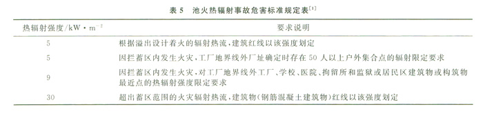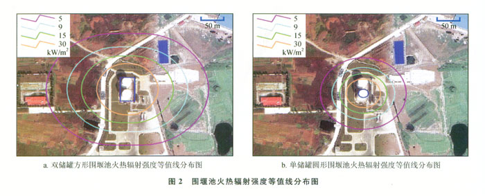NFPA 59A—2009標準對熱輻射安全值的限定如表5所示,依據標準對火災熱輻射強度安全值的規定,利用平臺分別對方形和圓形圍堰內池火熱輻射進行計算分析,熱輻射影響范圍如圖2。由圖2-a可知,兩個儲罐共用一個圍堰,導致池火面積較大,熱輻射波及廠區周圍較大范圍;由圖2-b可知,對單個儲罐建立與儲罐外罐相當的圓形高圍堰(如雙容罐和全容罐),可大大減小池火面積,熱輻射波及范圍明顯縮小,且避免當只有單個儲罐發生泄漏而引發與它共用一個圍堰的儲罐發生連帶事故。因此,為減小池火事故波及范圍,在設置儲罐圍堰時,應考慮盡量減小圍堰面積,即減小池火面積,必要時可在儲罐周圍設置高圍堰或采用雙容罐和全容罐,一方面可將火災控制在較小范圍,另一方面可盡量減小對附近其他危險源的影響,以免發生連帶事故。這也正是為什么國際上普遍認為采用雙容罐或全容罐安全等級高的原因。