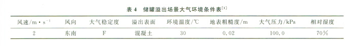 設定蒸氣擴散事故發生在裝卸車區,分為有集液池和無集液池兩種情況進行模擬計算。LNG從卸料口泄漏,泄漏速率0.05 m3/s,持續10 min。泄漏的LNG流入集液池(有集液池)或地面(無集液池),發生閃蒸氣化,瞬時產生大量蒸氣,形成低溫的重氣云團沿下風向擴散。依據NFPA 59A—2009標準,結合當地氣象條件,設定重氣擴散發生時的大氣及環境條件如表4。