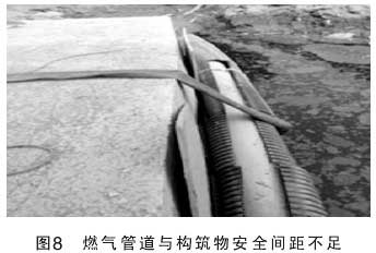 主要表現在:1)對壓力管道安全知識缺乏和對壓力管道有關介質(如液化石油氣和天然氣)安全知識貧乏;2)對安全距離重視不足,壓力管道與其它設施距離不符合規范(GB50028-2006)相關要求,壓力管道與生活設施安全距離不足;3)無安全操作制度或有規定要求不嚴格執行(如圖6、7、8)。