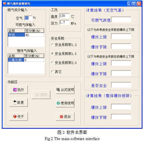 ??? (1)執行:鼠標單擊即可在計算結果框中得到所輸燃氣成份、相關參數下的燃氣安全爆炸極限。