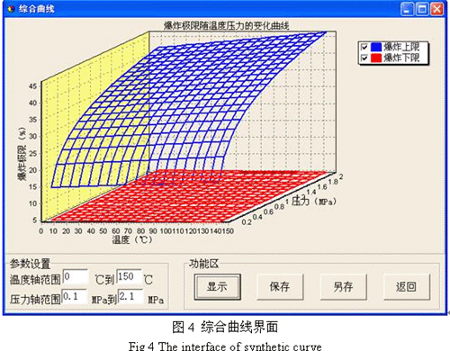 ??? 通過本窗口可以進行溫度,壓力單獨對燃氣輸送安全爆炸極限的影響,也可以進行溫度和壓力綜合對燃氣輸送安全爆炸極限的影響曲線分析,例如鼠標單擊綜合曲線即可進入如下綜合燃氣輸送安全影響界面: