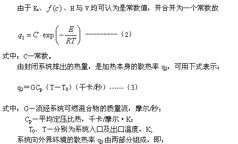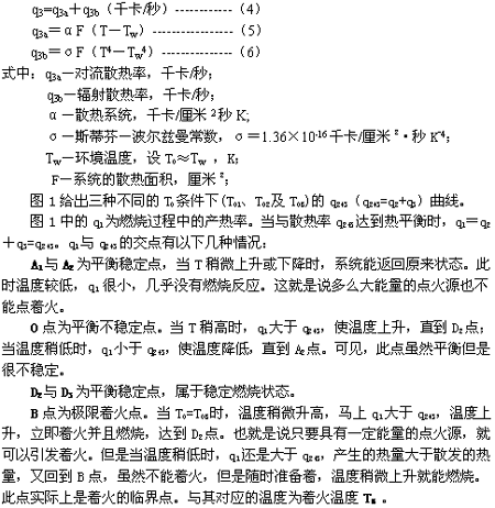 ??? 大氣中的火焰或燃燒室中燃氣的燃燒都可看作一個封閉的熱力系統,任何時候均以熱平衡為其存在條件。這種熱平衡就是產生熱量(產熱率)與散發熱量(散熱率)之間的相等關系。當產生熱量大于散發的熱量時,熱量的積累使溫度不斷升高,產生燃燒現象,相反,產生熱量小于散發的熱量時,溫度降低,會使燃燒熄滅。根據熱平衡的關系式可以分析著火、熄火以及爆炸的極限條件。